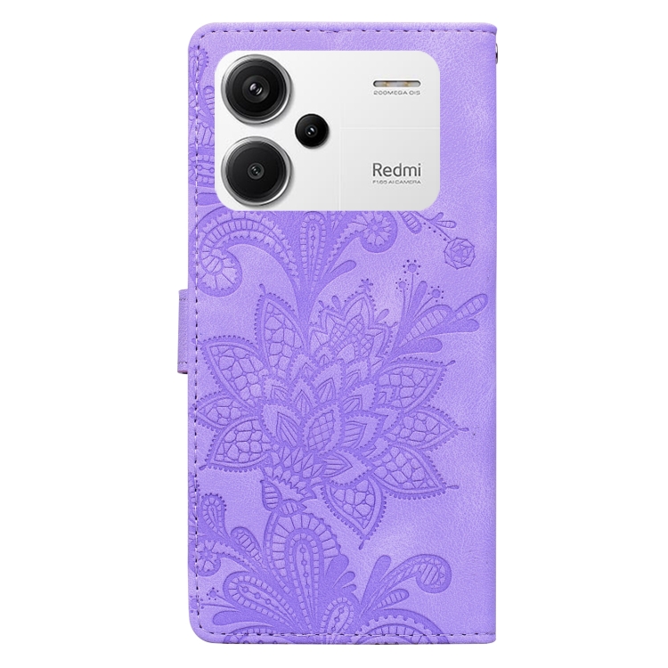 Funda de Teléfono con Hebilla Magnética de Pu con Encaje Floral En Relieve y Correa para la Muñeca para Redmi Note 13 Pro+ (Morado)