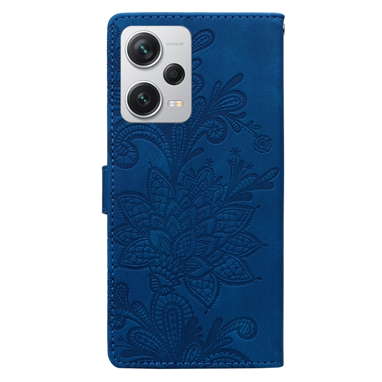 Funda de Teléfono con Hebilla Magnética y Encaje Floral En Relieve para Redmi Note 12 Pro+ 5G Global con Correa para la Muñeca (Azul)