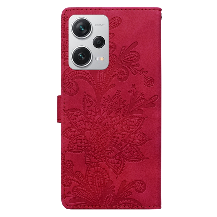 Funda de Teléfono con Hebilla Magnética y Encaje Floral En Relieve para Redmi Note 12 Pro+ 5G Global con Correa para la Muñeca (Rojo)
