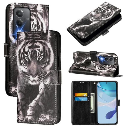 Funda de Teléfono de Cuero con Patrón de Dibujo de Colores de Tejido Liso para Oppo K12X 5G Global (Tigre Blanco y Negro)