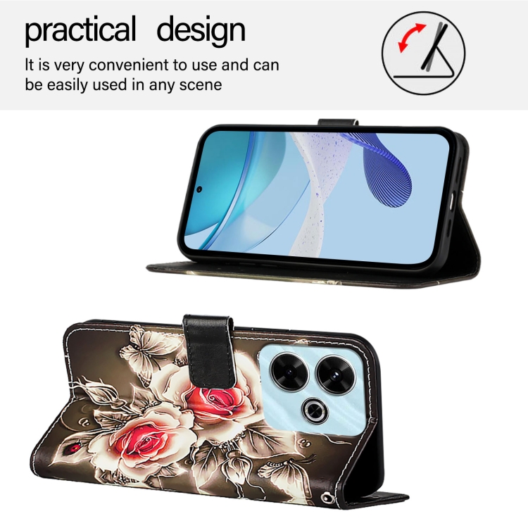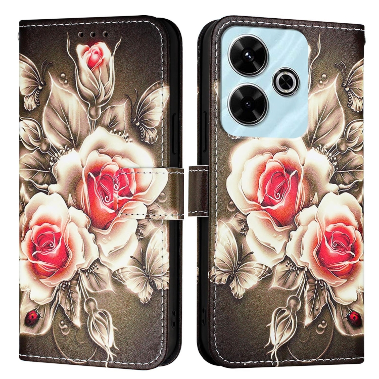 Funda de Teléfono de Cuero con Patrón de Dibujo de Colores de Tejido Liso para Xiaomi Redmi 13 4G (Rosas Sobre Negro)
