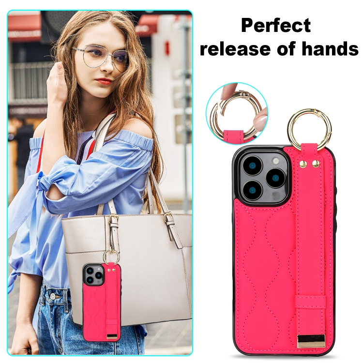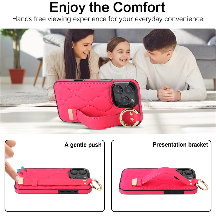 Funda de teléfono PU con anillo cobertura total antideslizante para iPhone 16 Pro con pulsera (Rosa Rojo)