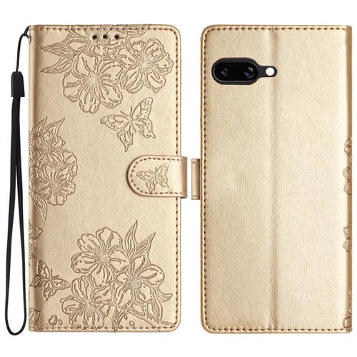 Funda de teléfono PU Google Pixel 9A con relieve Mariposa y flor de Cerezo (Dorada)