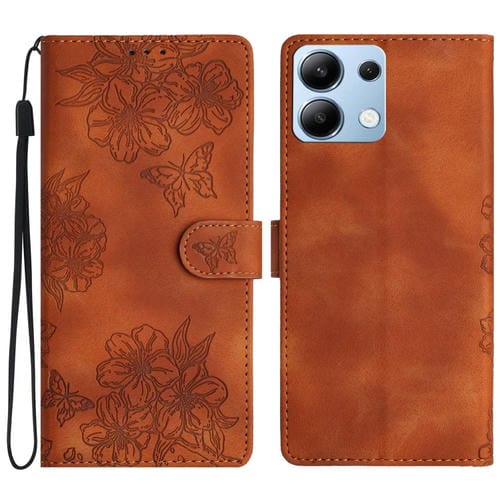 Funda de Teléfono de Pu con Relieve de Piel de Mariposa y Diseño de Flor de Cerezo para Redmi Note 13 4G (Marrón)