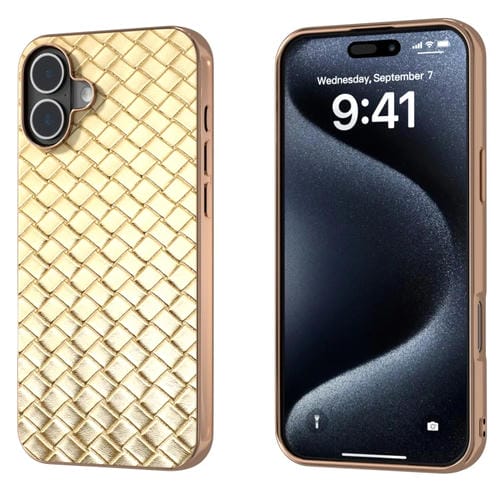 Funda de teléfono PU con textura tejida y marco galvanizado para iPhone 16 Plus (Dorado)