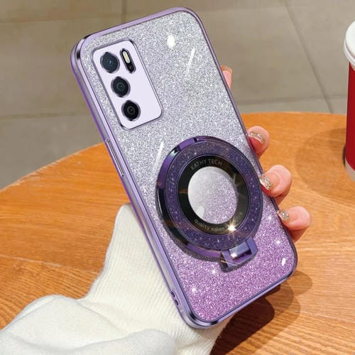 Funda de Teléfono de TPU con Soporte Redondo y Purpurina Degradada Plateada para Oppo A16 (Morado)