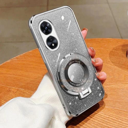Funda de Teléfono de TPU con Soporte Redondo y Purpurina Degradada Plateada para Oppo A97 5G (Plateada)