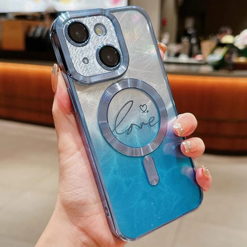 Funda de Teléfono TPU Magsafe Dual-Love con Purpurina y Degradado de Plumas para iPhone 13 (Azul)