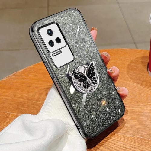 Funda de TPU con Soporte para Teléfono con Diseño de Mariposa y Purpurina Degradada para Redmi K50/K50 Pro (Negra)