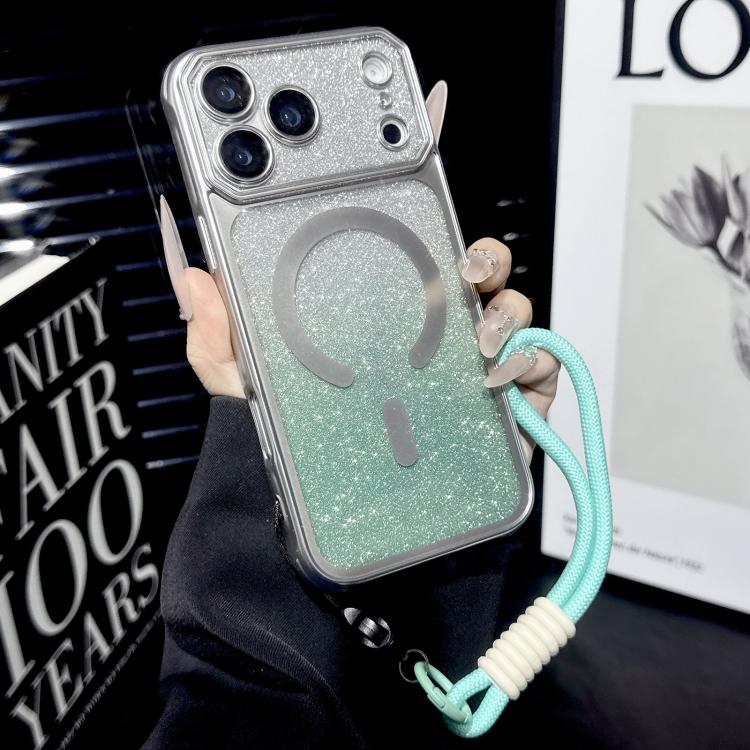 Funda de TPU MagSafe con ventana grande, brillo degradado, mate, galvanizada, con correa de mano para iPhone 17 Pro Max (plateada)