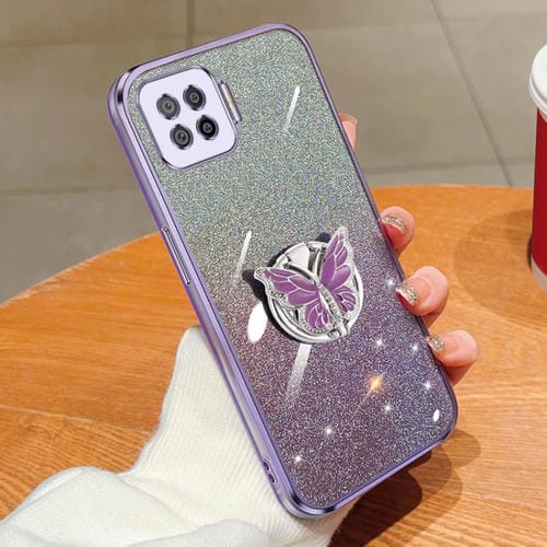 Funda de TPU para Teléfono con Soporte de Mariposa con Purpurina Degradada Plateada para Oppo F17 (Morado)