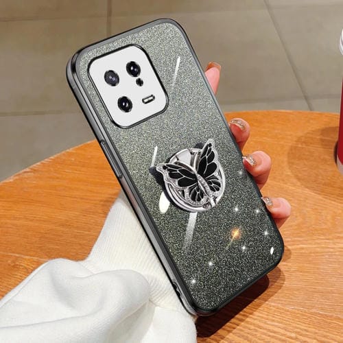 Funda de TPU para Teléfono Xiaomi 13 con Soporte de Mariposa con Purpurina Degradada (Negra)