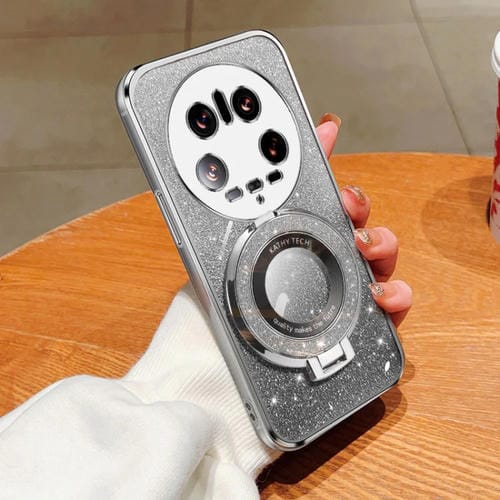 Funda De Tpu Para Teléfono Xiaomi 14 Ultra Con Soporte Redondo Y Purpurina Degradada (Plateada)