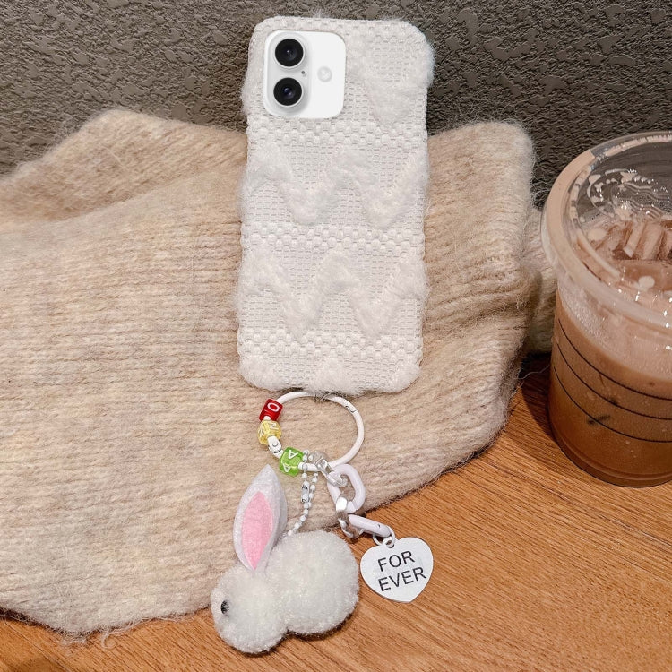 Funda híbrida poliuretano iPhone 16 con textura felpa y llavero de muñeca (Blanco)
