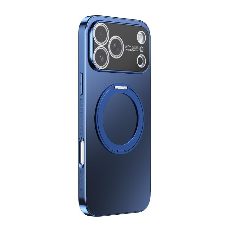 Funda MagSafe electrochapada para iPhone 17 Pro Max con soporte giratorio de 360 grados y cubierta para lente (azul marino).