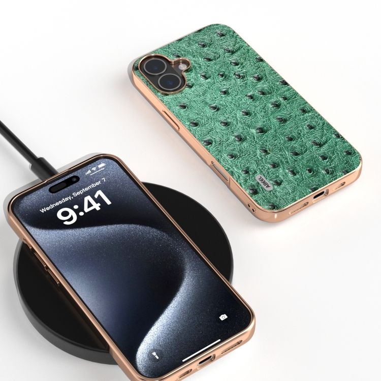 Funda para iPhone 16 Abeel Textura de Avestruz Marco Galvanizado Cuero Genuino (Verde)