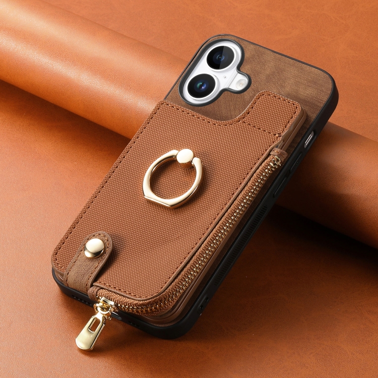 Funda para iPhone 16 con Cremallera Vertical y Anillo Cruzado de Cuero (Marrón)