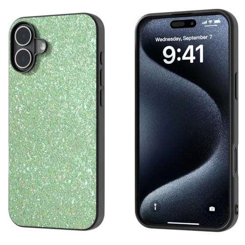 Funda para iPhone 16 Plus con Marco Negro y Purpurina de Colores (Verde Oscuro)