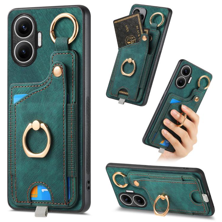 Funda para Redmi Turbo 4 Pro con diseño retro de piel sintética y anillo para tarjetas, con asa para colgar (verde)