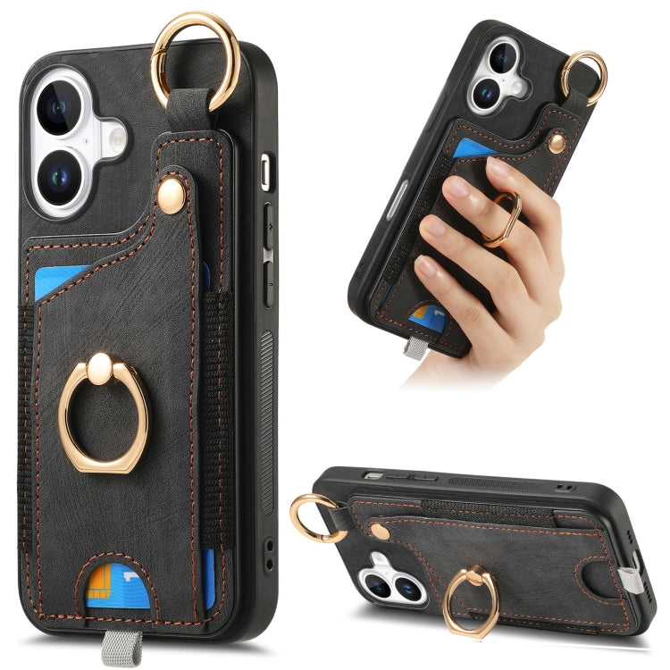 Funda para Teléfono iPhone 16 con Anillo y Tarjetero Estilo Retro con Asa para Colgar (Negra)