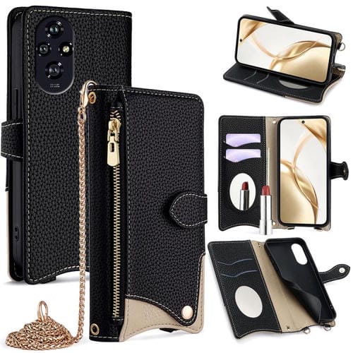 Funda para Teléfono Honor 200 con Cadena Cruzada y Diseño Cola de Pez de Cuero de Lichi (Negro)
