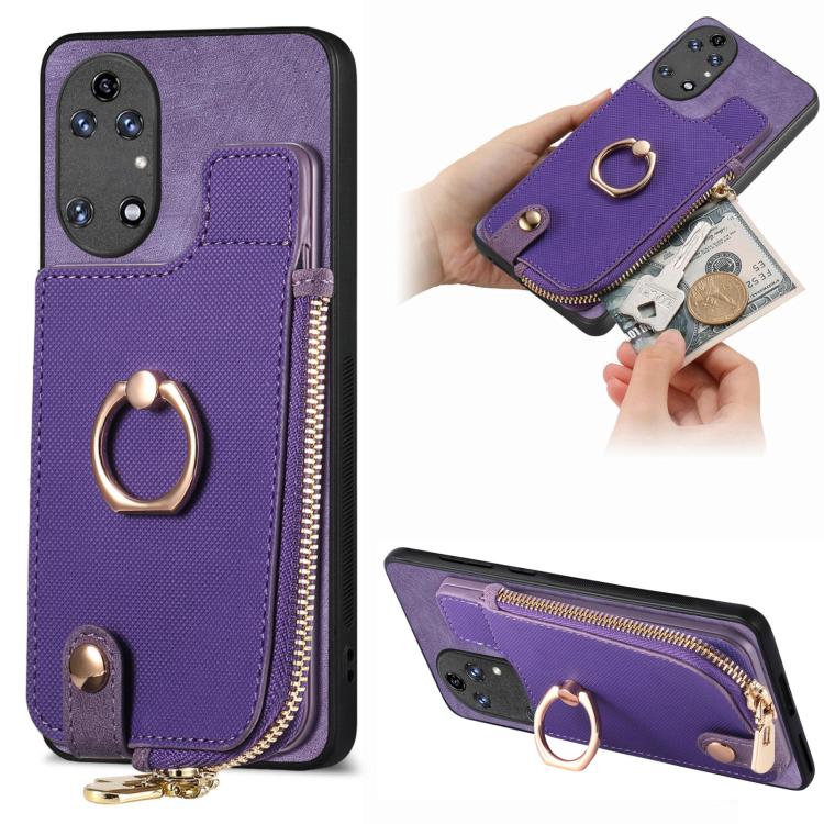 Funda para Teléfono Huawei P50 con Cremallera Vertical y Anillo de Cuero Cruzado (Morado)