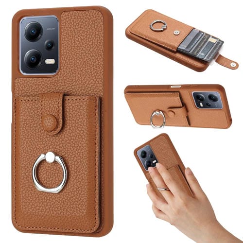 Funda para Teléfono con Diseño de Textura de Lichi y TaRJetero con Anillo para Redmi Note 12 5G (Marrón)