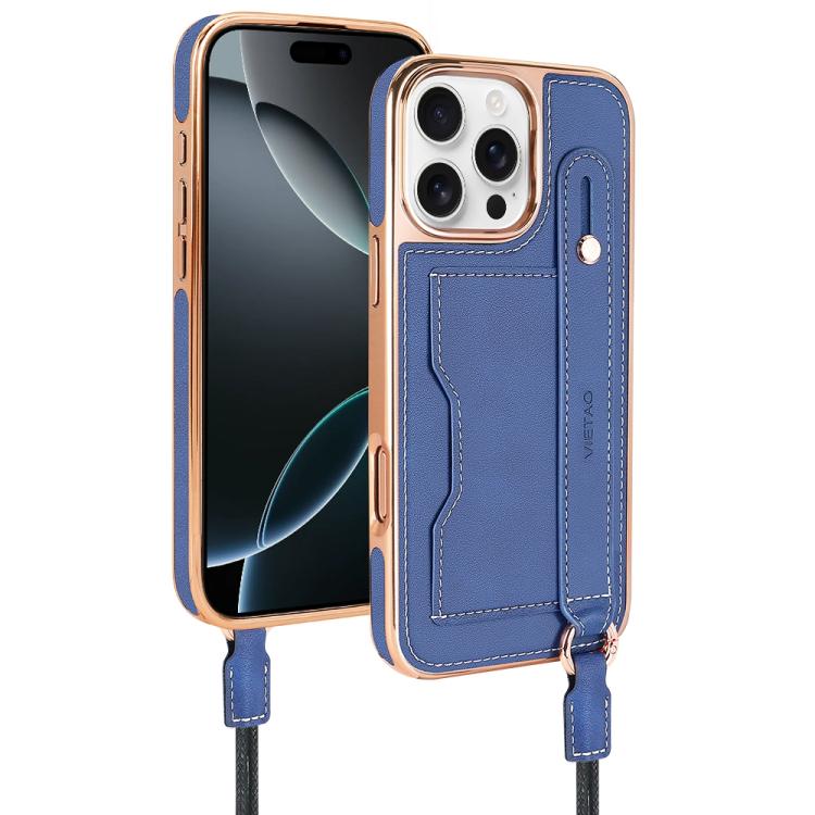 Funda para teléfono Vietao iPhone 16 Pro Max ranura para tarjeta correa de muñeca (Azul)