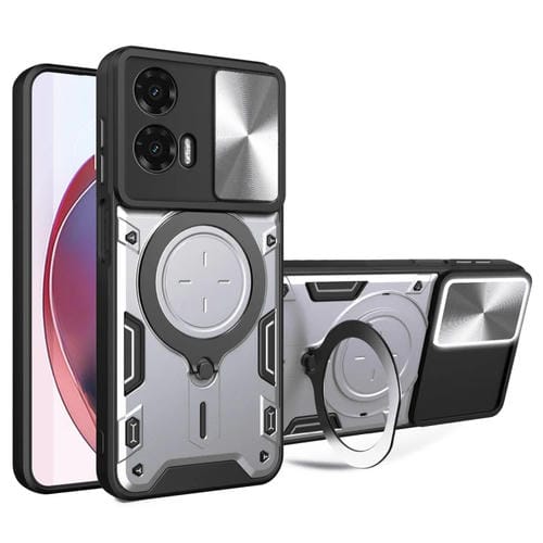 Funda para Teléfono Motorola Moto G35 con Soporte Magnético Deslizante y Textura de Cd (Plateada)