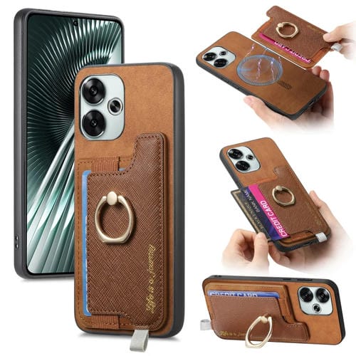 Funda para Teléfono con TaRJetero y Anillo de Cuero con Diseño Retro Magsafe Cross para Redmi Turbo 3 5G (Marrón)