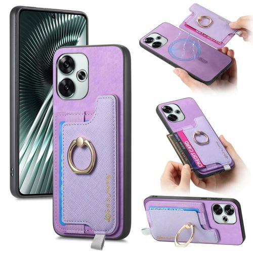 Funda para Teléfono con TaRJetero y Anillo de Cuero con Diseño Retro Magsafe Cross para Redmi Turbo 3 5G (Morado)