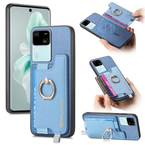 Funda para Teléfono con TaRJetero y Anillo de Cuero con Diseño Retro Magsafe Cross para Vivo S18/S18 Pro 5G (Azul)
