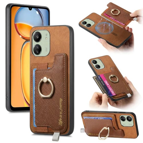 Funda para Teléfono con TaRJetero y Anillo de Cuero con Diseño Retro Magsafe para Redmi 13C / Poco C65 / M6 (Marrón)