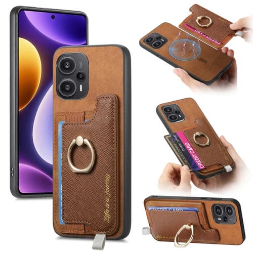 Funda para Teléfono con TaRJetero y Anillo de Cuero con Diseño Retro Magsafe para Redmi Note 12 Turbo/Poco F5 5G (Marrón)
