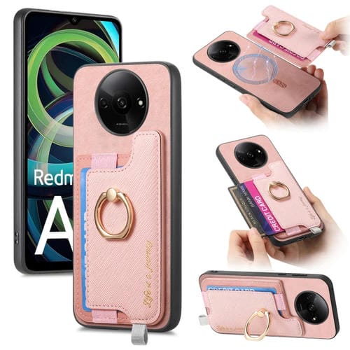 Funda para Teléfono con TaRJetero y Anillo de Cuero con Diseño Retro Magsafe para Xiaomi Redmi A3 (Rosa)