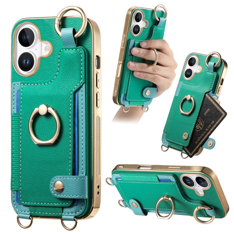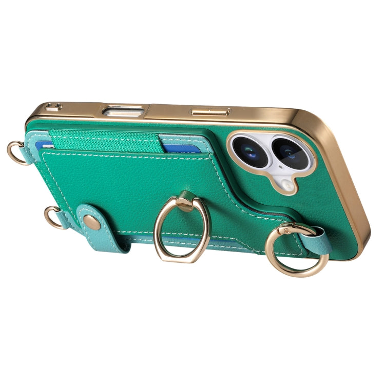 Funda para Teléfono iPhone 16 con Tarjetero, Anillo y Lazo para Colgar (Verde)