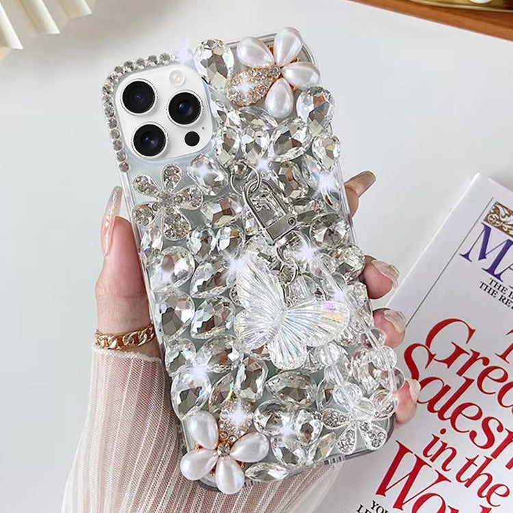 Funda para teléfono PC con incrustaciones de diamantes y mariposas para iPhone 16 Pro (Blanca)