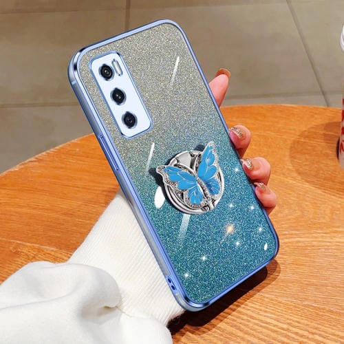 Funda para Teléfono de TPU con Soporte para Mariposas con Purpurina Degradada Chapada para Vivo V20 Se (Azul Sierra)