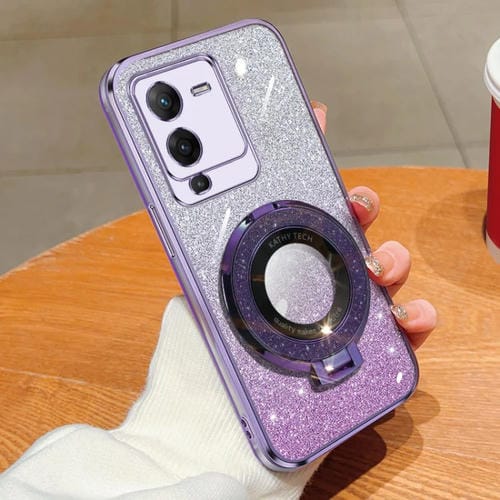 Funda para Teléfono de TPU con Soporte Redondo y Purpurina Degradada Plateada para Vivo S15 (Morado)