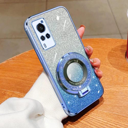 Funda para Teléfono de TPU con Soporte Redondo y Purpurina Degradada Plateada para Vivo X60 (Azul Sierra)