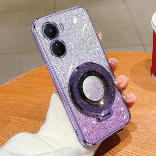 Funda para Teléfono de TPU con Soporte Redondo y Purpurina Degradada Plateada para Vivo Y16 (Morado)