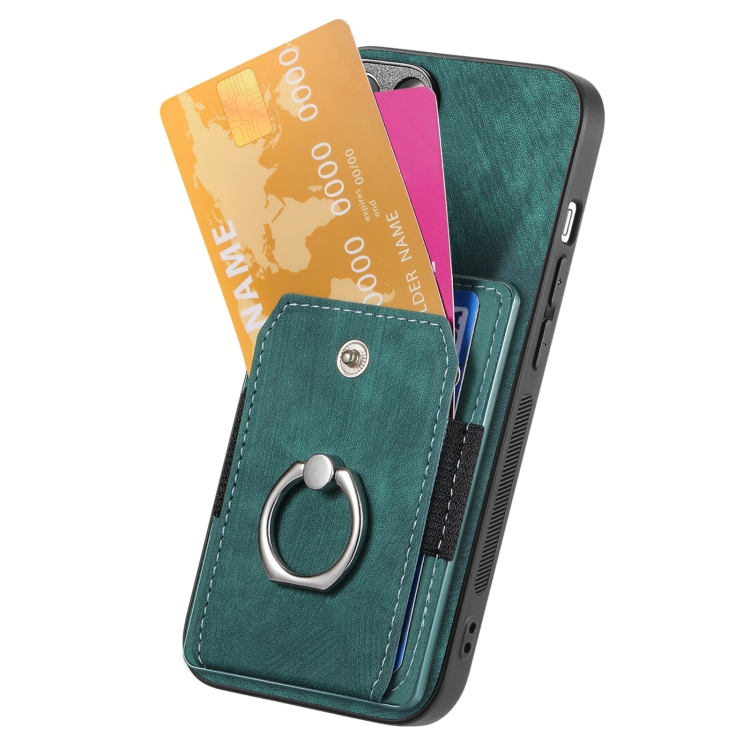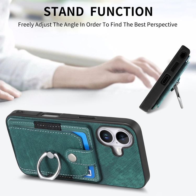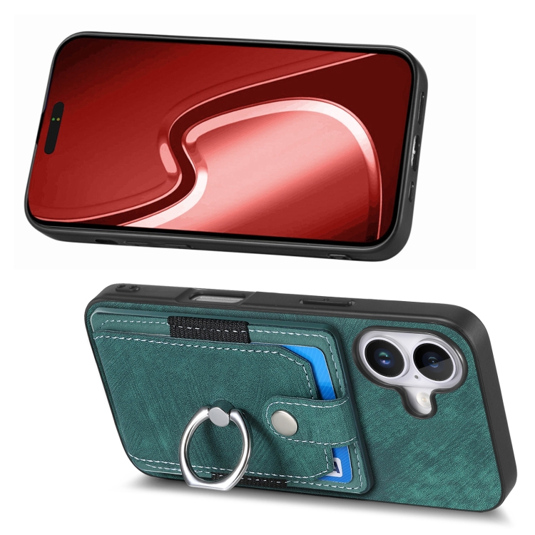 Funda Tipo Billetera para iPhone 16 con Anillo y Tarjetero con Tacto de Piel (Verde)