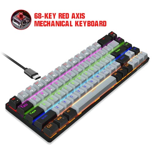 El Teclado mecánico Hxsj V800 es un periférico Cableado compacto de 68 teclas diseñado para usuarios que requieren precisión y durabilidad en entornos de oficina y gaming. Cuenta con Conexión mediante interfaz Tipo-C, asegurando una transmisión rápida y estable compatible con sistemas operativos Windows (XP, 7, 8, 10), Android y Mac OS. Este Teclado incorpora ejes mecánicos rojos que proporcionan una respuesta Táctil lineal y silenciosa, ideal para mecanografía y Juegos que demandan pulsaciones rápidas y repetitivas. Además, dispone de retroiluminación LED con 20 efectos luminosos configurables, facilitando su uso en ambientes con poca iluminación y mejorando la experiencia visual. Su diseño incluye teclas de doble inyección en ABS en colores Negro y Gris, garantizando resistencia al desgaste y una estética moderna.