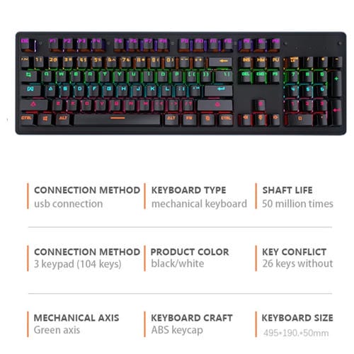 - 1x Teclado Mecánico Alámbrico Leaen K880 104 Teclas Green Axis Gaming Oficina (Negro) Cable 1.6M