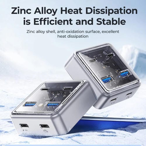 Dispone de una entrada USB-C y cuatro salidas: dos USB-A y dos USB-C, facilitando la Conexión de diversos dispositivos.