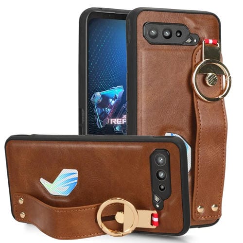Funda Trasera de Cuero con Muñequera para Asus Rog Phone 5 ZS673KS (Marrón)