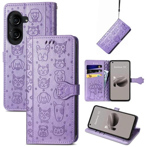 Funda de Cuero para Asus Zenfone 10 con Relieve Gatos y Perros (Púrpura)