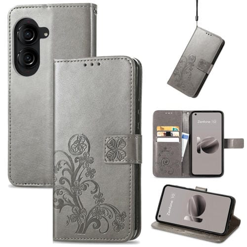 Funda de Cuero para Asus Zenfone 10 con Hebilla en Relieve y Cierre de Cuatro Hojas (Gris)