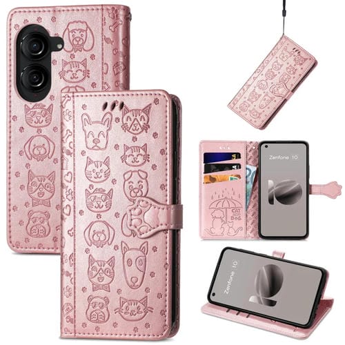Funda para Asus Zenfone 10 de Cuero con Relieve de Gato y Perro (Oro Rosa)