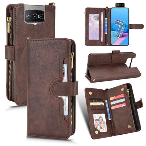 Funda de Cuero para Asus Zenfone 7 Pro Zs671Ks con Litchi Textura y Cremallera (Marrón)